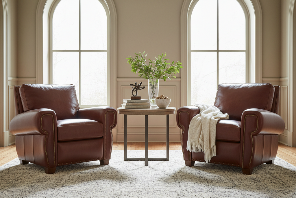 The Weston Rustic Leather Pillowback Recliner measuring W41" x D40" x H37.5" armchair with nailhead trim features multiple reclining positions, including TV (shown) and fully reclined. This rustic recliner is available in 40 distinct leather colors and 2 leg color choices. Sink into luxury with the Weston Rustic Leather Pillow Back Recliner, handcrafted in North Carolina using premium leather selections. This statement piece combines timeless rustic charm with modern comfort, featuring a supportive pillow back design and decorative nailing details that add character to any room. Choose from 40 exquisite leather options to match your personal style perfectly. The smooth reclining mechanism provides effortless relaxation, while the durable construction ensures years of enjoyment. Whether you're unwinding after a long day or hosting guests, this custom-made recliner delivers both sophistication and comfort that transforms your living space into a sanctuary of style.